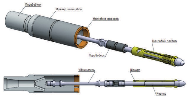 В качестве узла захвата используется лепестковый цанговый ловитель. Ловитель состоит из переводника ловителя, корпуса, штифта и цангового захвата. Ловитель проходит через пакер-пробку и выходит из нижнего торца. Режуще-истирающая поверхность кольцевого фрезера расфрезеровывает плашки пакер-пробки, пакер-пробка перемещается вниз и захватывается ловителем, после чего вся компоновка поднимается на поверхность. Для очистки от расфрезерованных частиц, над устройством может быть установлен шламометаллоуловитель.